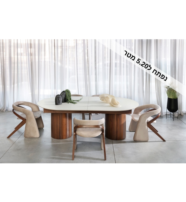 שולחן אוכל נפתח בצורת אליפסה, עם פלטת פורמייקה, מורכב משלד בגימור עץ ושני רגלי עץ אגוז.