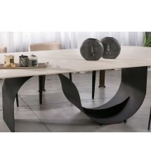שולחן אליפסה מפלטת שיש דקטון דמוי טרוונטין בשילוב רגל מושחרת ממתכת בצורת גל.