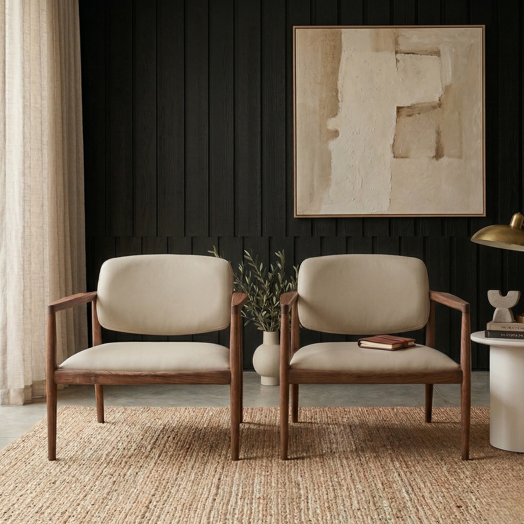 כורסא דגם אודיון (ODEON / 40-00041), עשויה מדמוי עור בגוון בז' ומסגרת עץ אגוז.