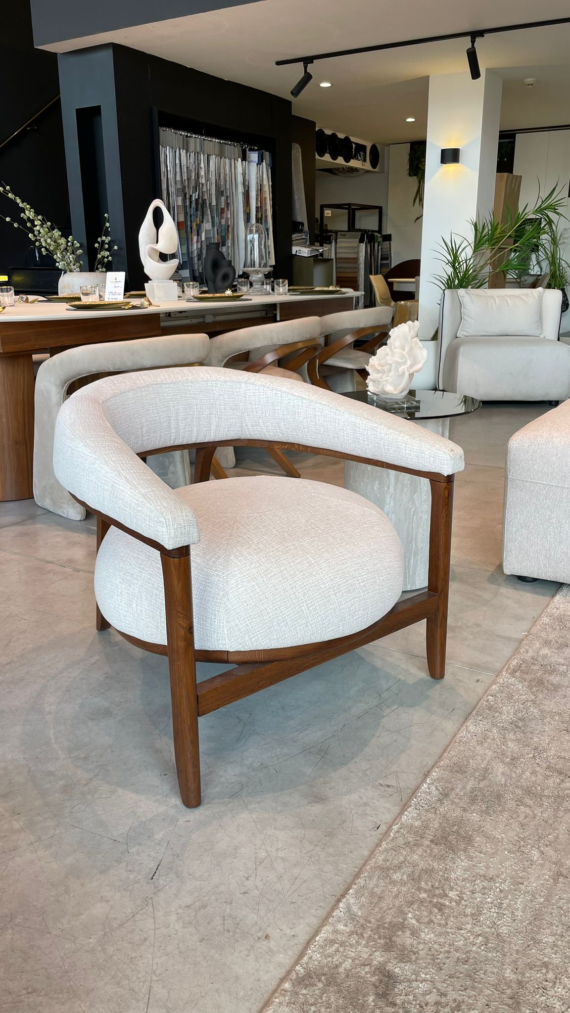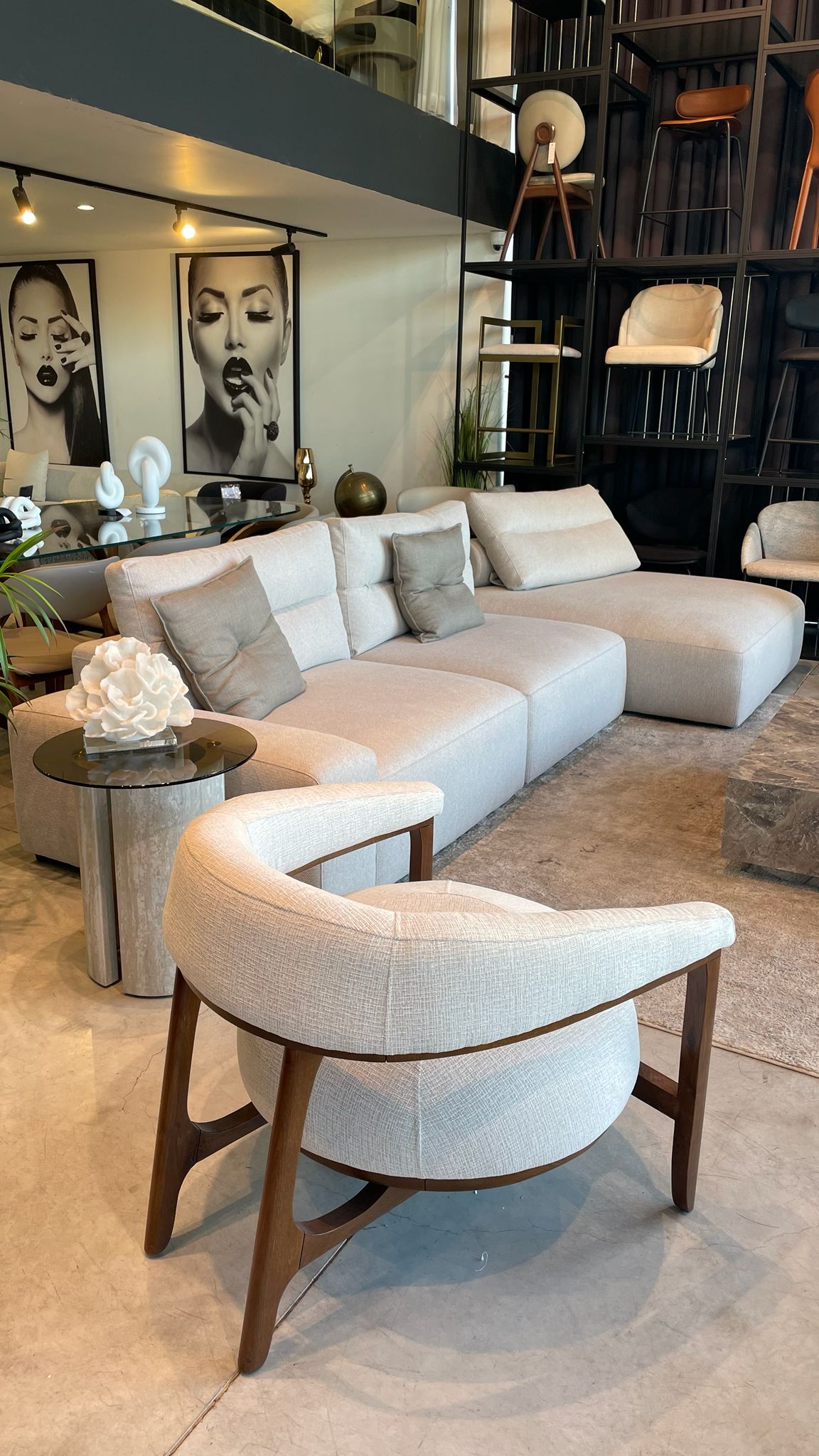 כורסא דגם ניקי, עשויה בד משולב בגוון אבן ורגלי אגוז.