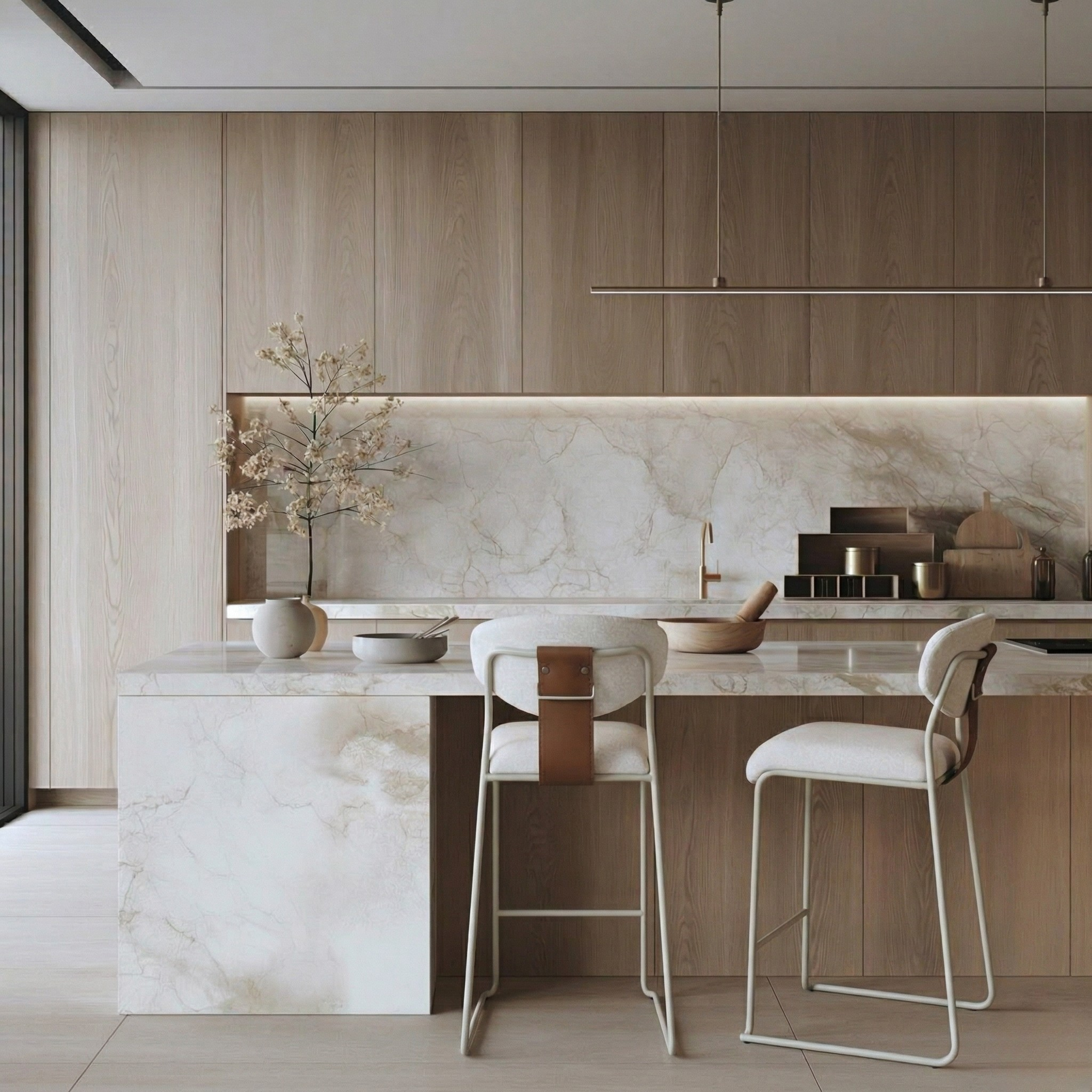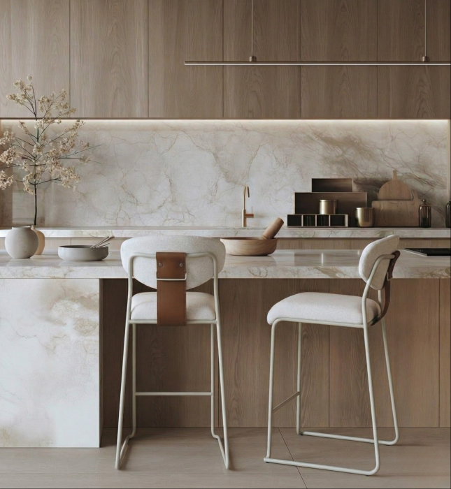 כיסא בר דגם ויקטוריה (B2505-H65) מושב בד בגוון אבן, גב חגורה גוון קאמל ורגלי מתכת עדינות.