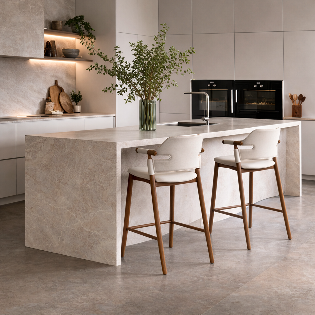 כיסא בר דגם סלינה, עשוי ממושב דמוי עור בגוון ניוד עם רגלי עץ אגוז / גוון אבן ורגלי אבן.