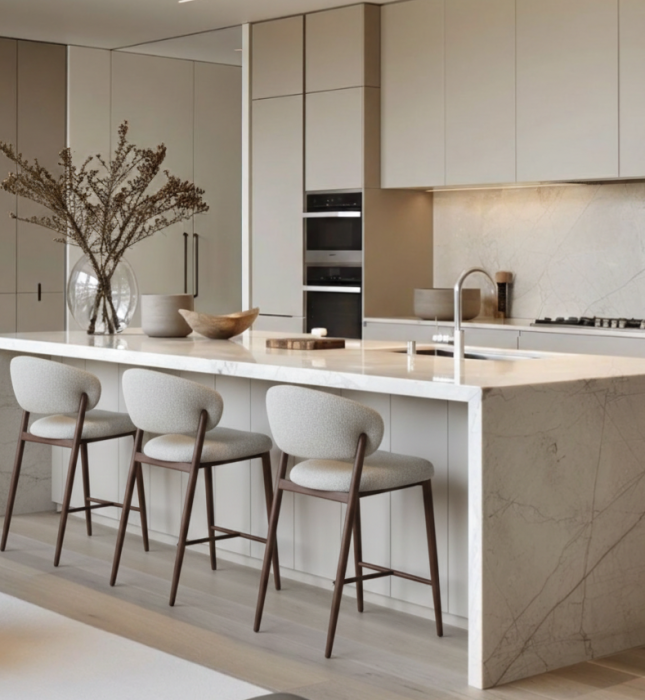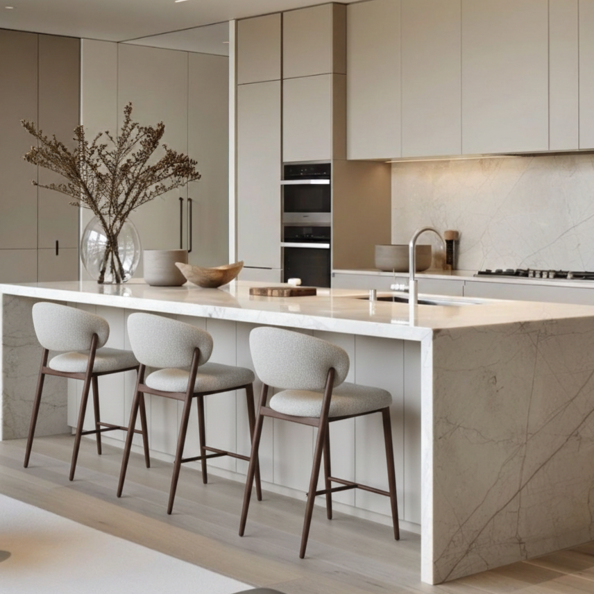 כיסא בר דגם הרפר (BY-4065), עשוי בד משולב בגוון אבן בשילוב רגלי מתכת דמוי עץ אגוז.