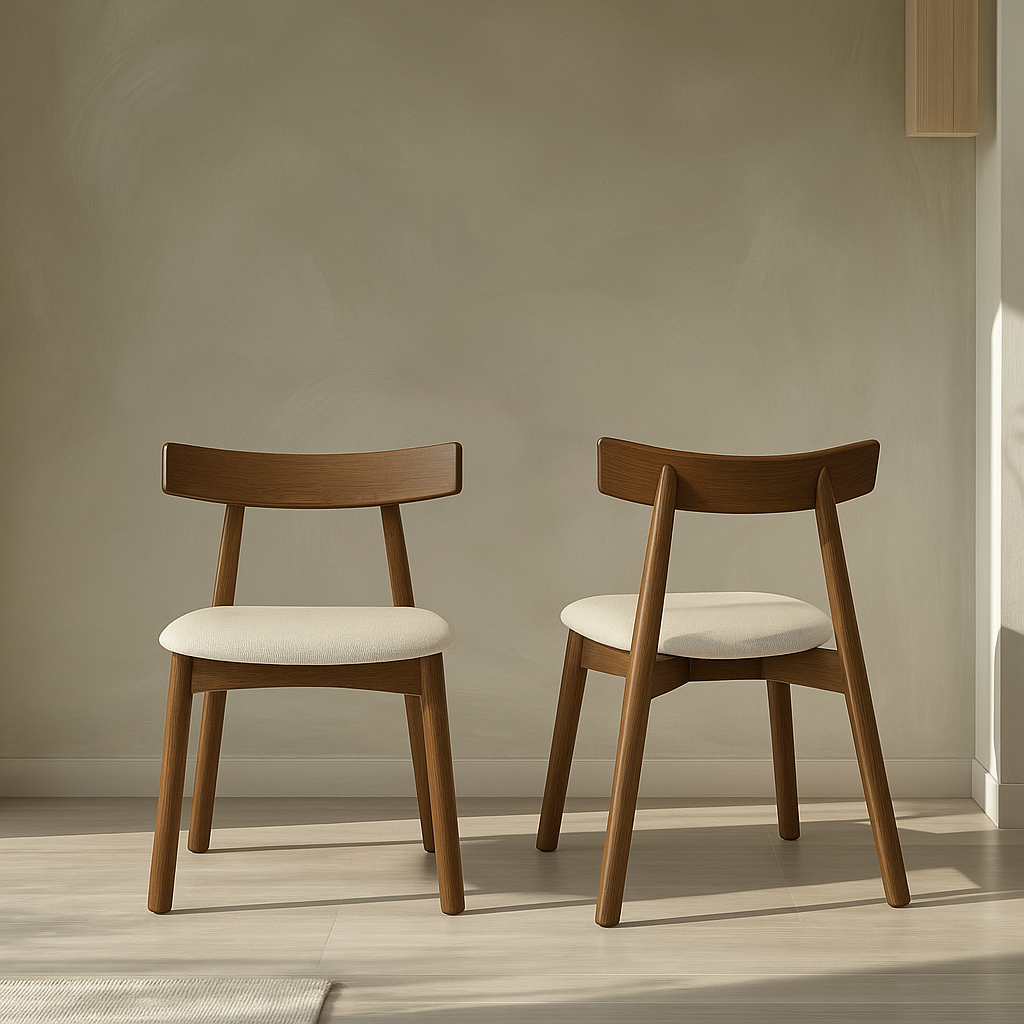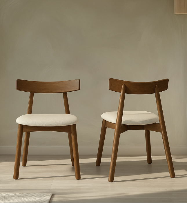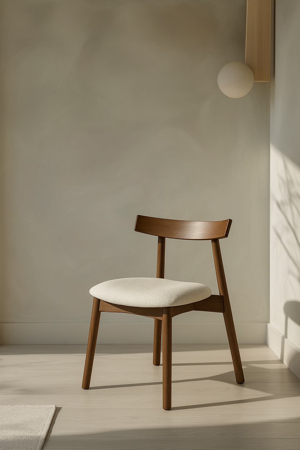 כיסא שולחן דגם לוקה, עשוי בד משולב בגוון שמנת ורגלי עץ אגוז.