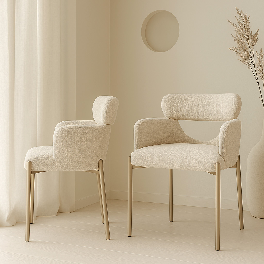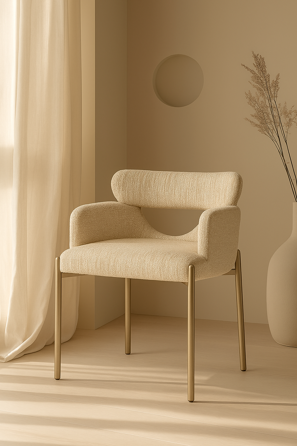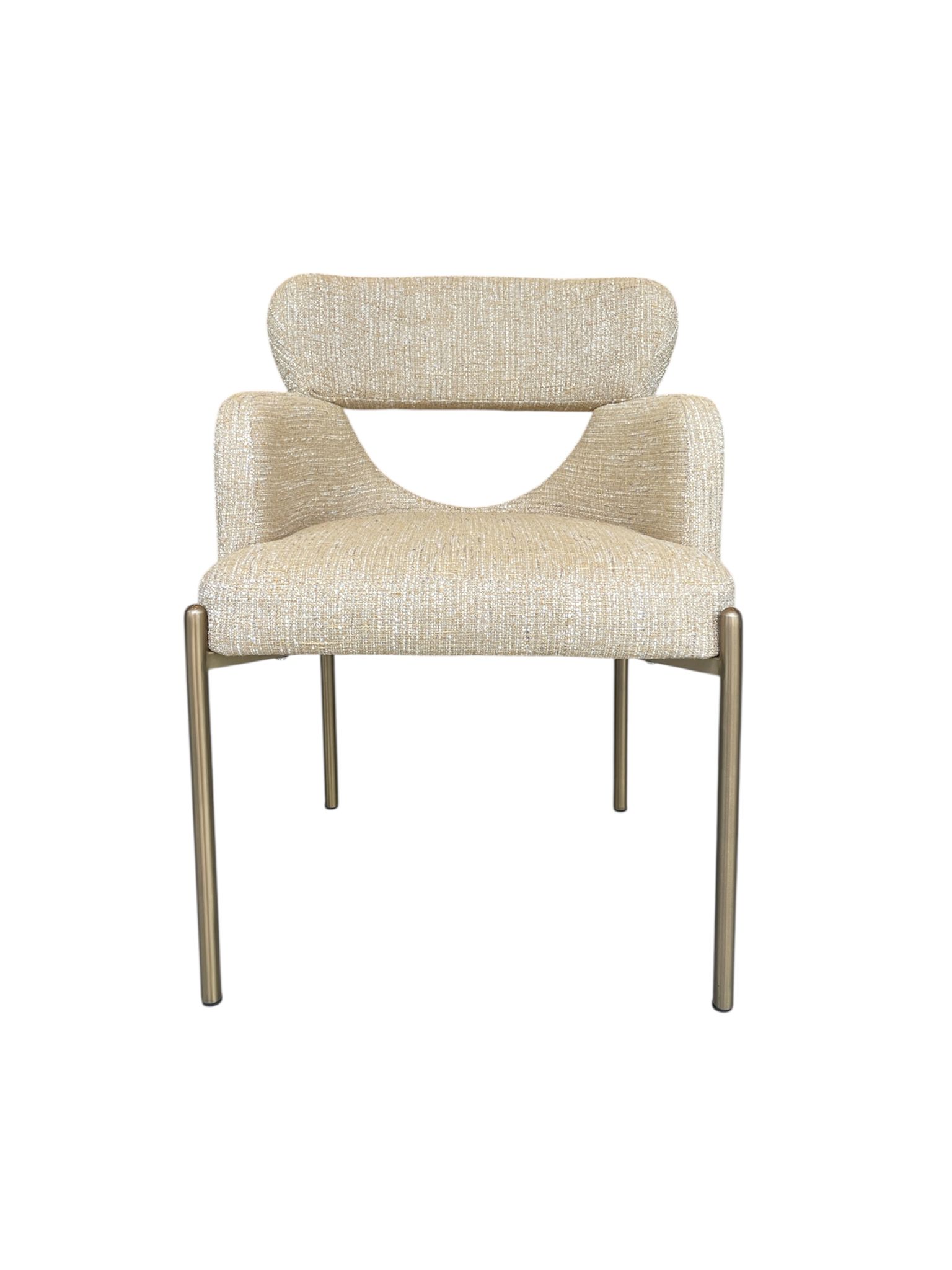 כיסא אוכל דגם גרניט (DC-6666ׂ), עשוי מבד משולב בגוון בז' ורגלי מתכת בגוון ברונזה.