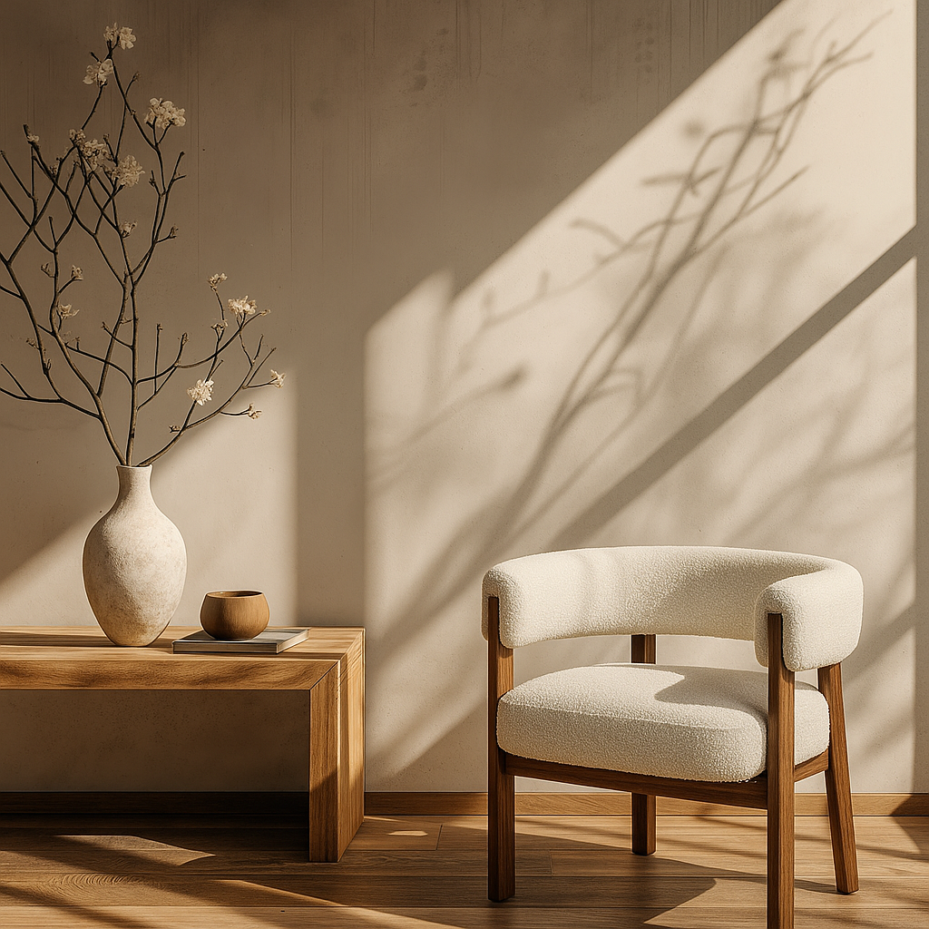כיסא אוכל דגם דולצ'ה (A-4028) עשוי מבד בוקלה בגוון בז' בשילוב רגל מתכת דמוי עץ אגוז.