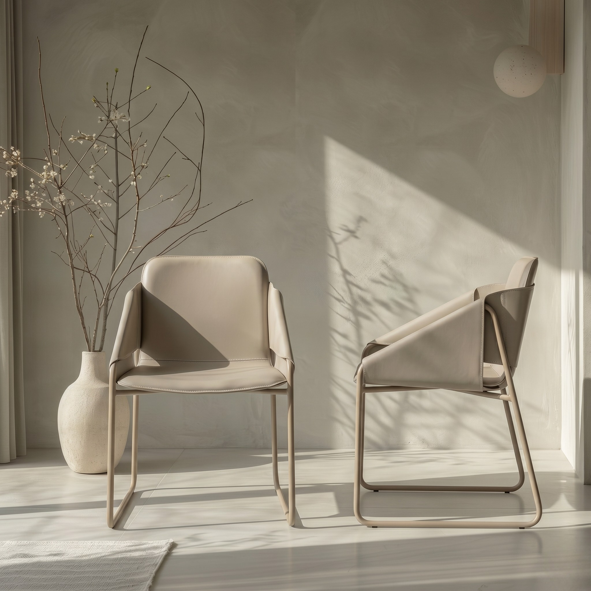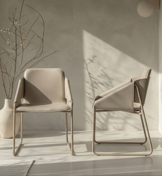 כיסא אוכל דגם דיור (ALC-1977) עשוי מדמוי עור בגוון אבן ורגלי מתכת.