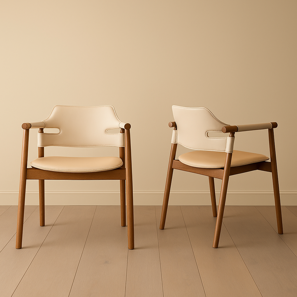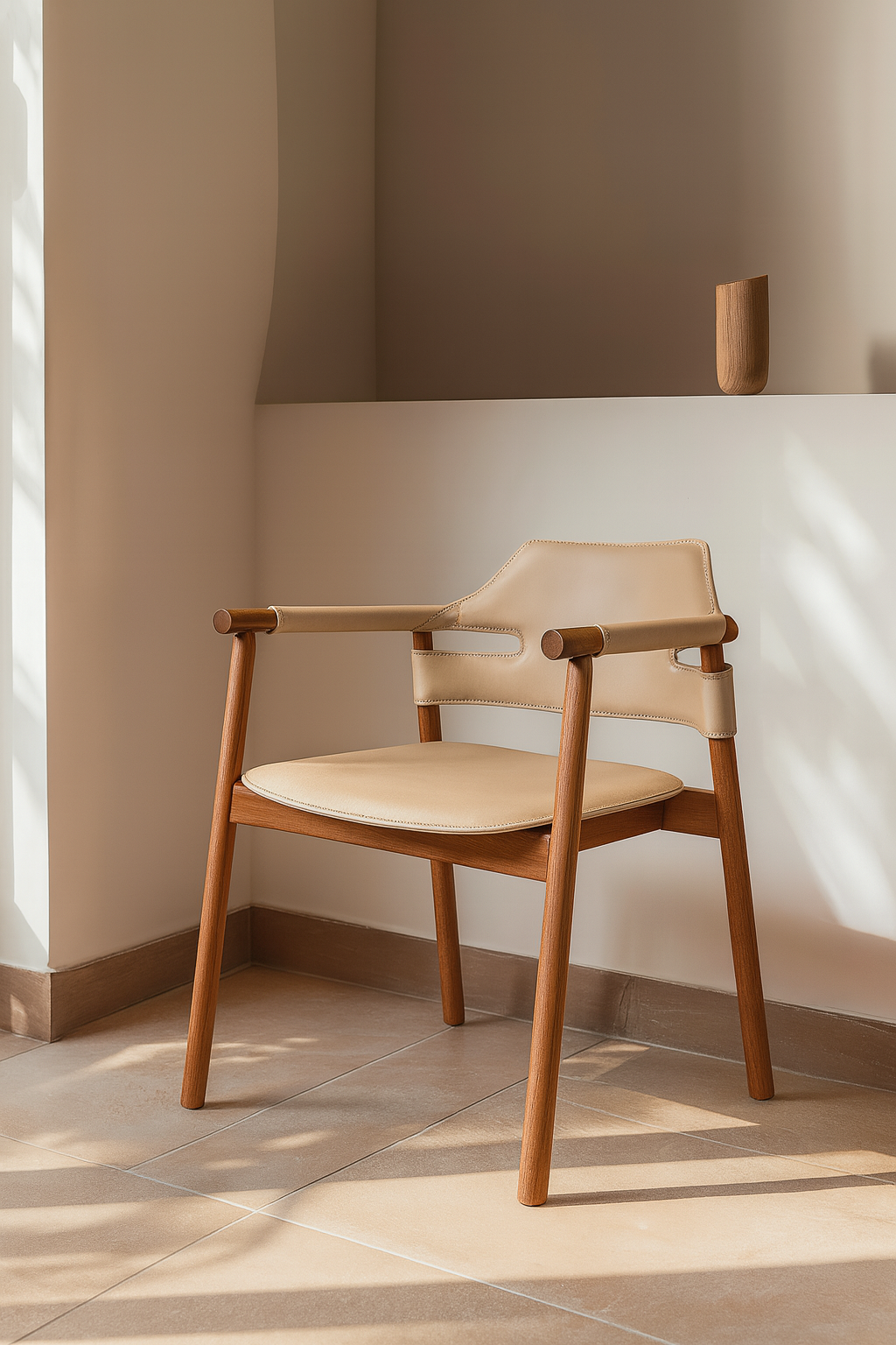 כיסא דגם סלינה עשוי דמוי עור בגוון ניוד ורגלי אגוז.