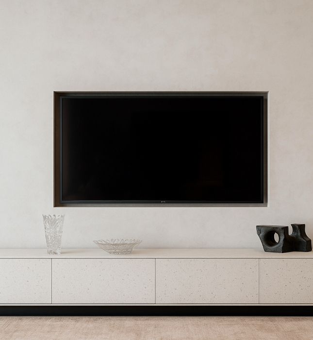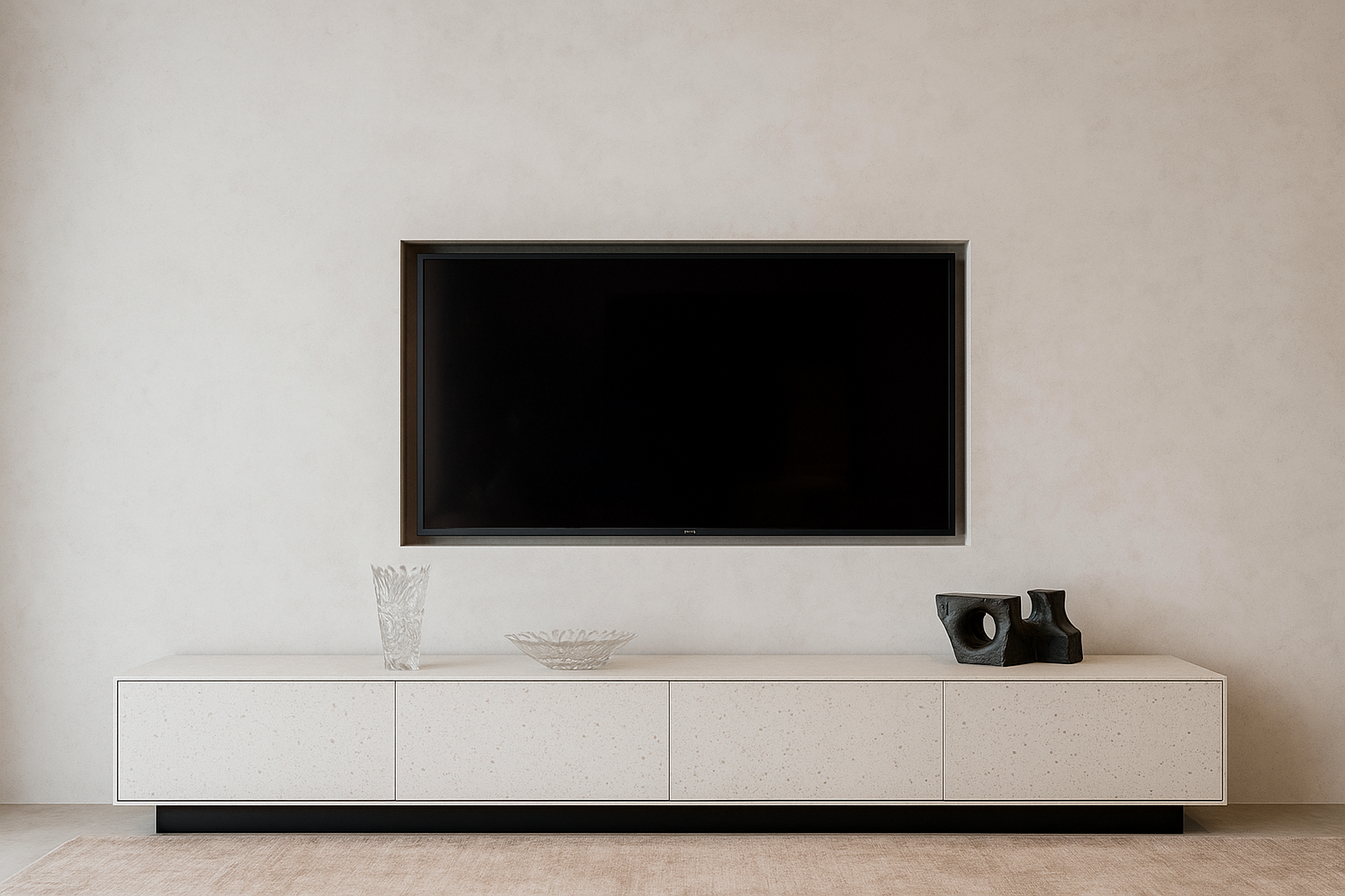מזנון בהתאמה אישית, מכיל אחסון רב, מחומר טרצו בגוון שמנת.