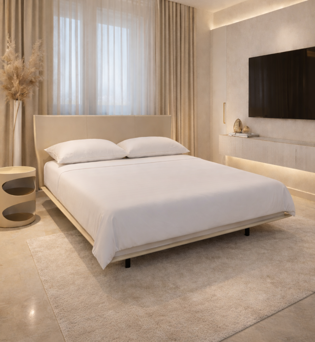 מיטה דגם אייס (Aiys) עשויה מדמוי עור בגוון בז' וקיימת במגוון מידות לבחירה.