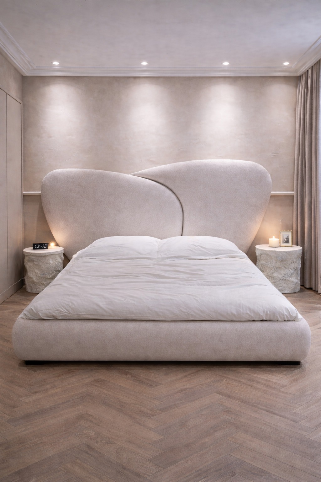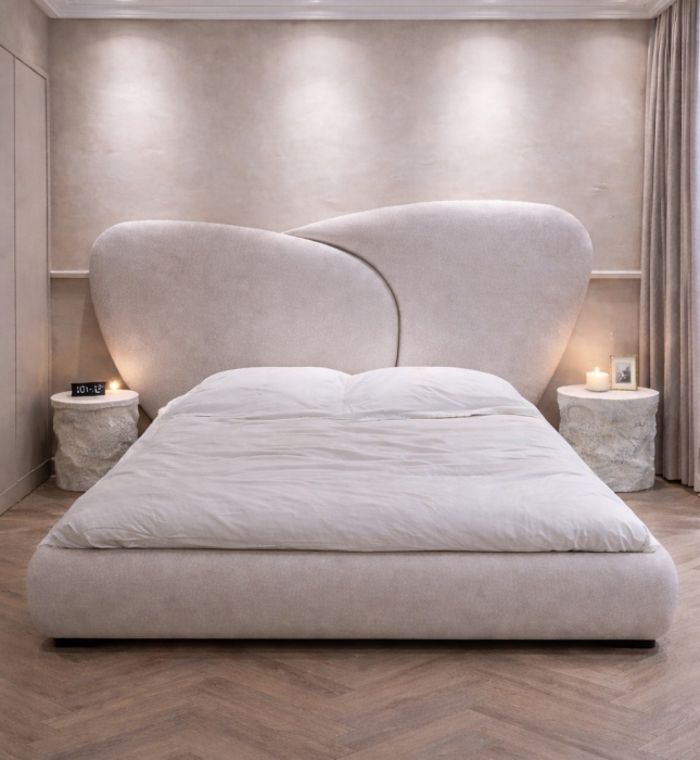 מיטה זוגית בעיצוב יוקרתי ומרשים עם גב בסגנון תלת מימד, בגוון אבן.