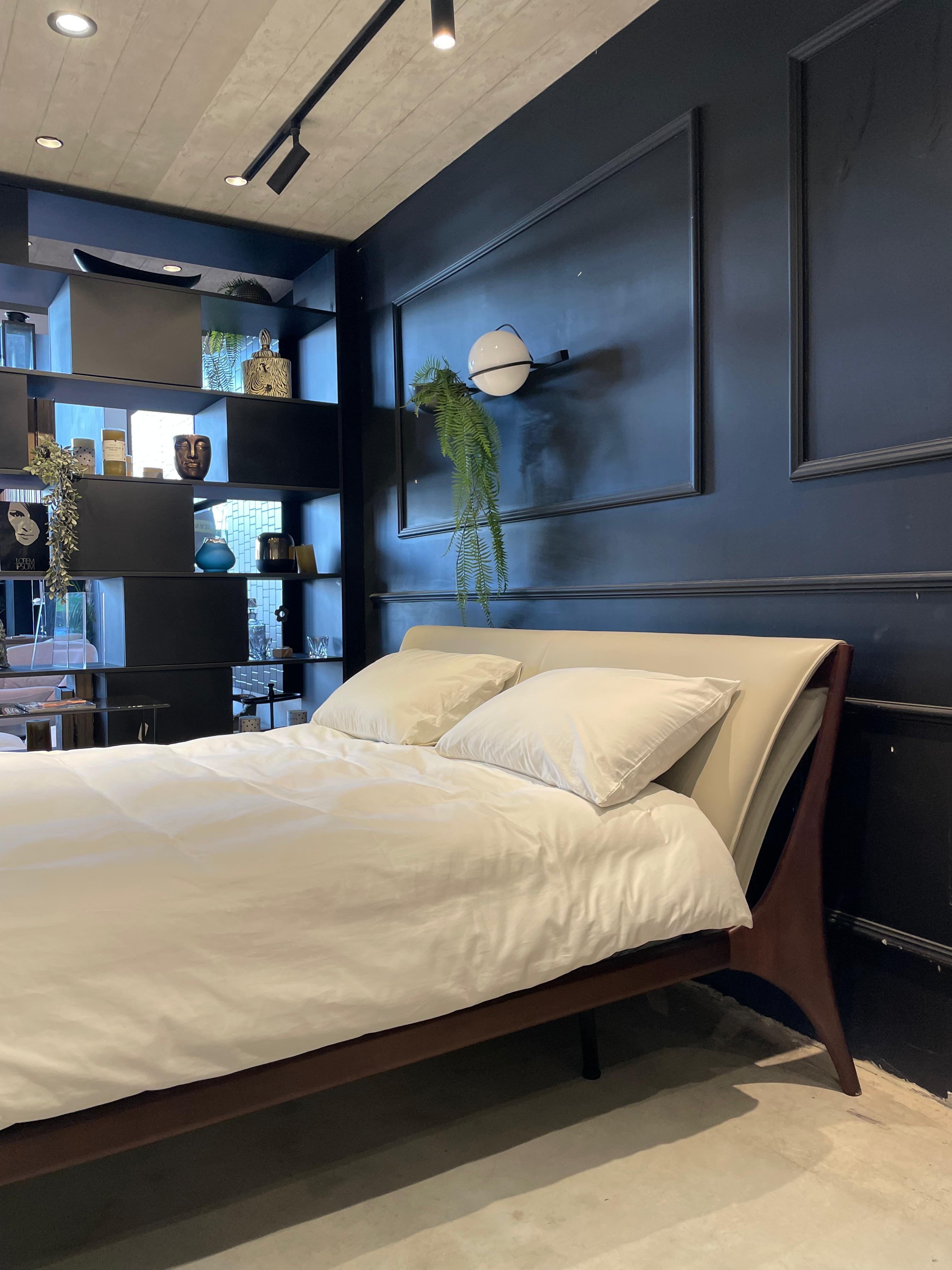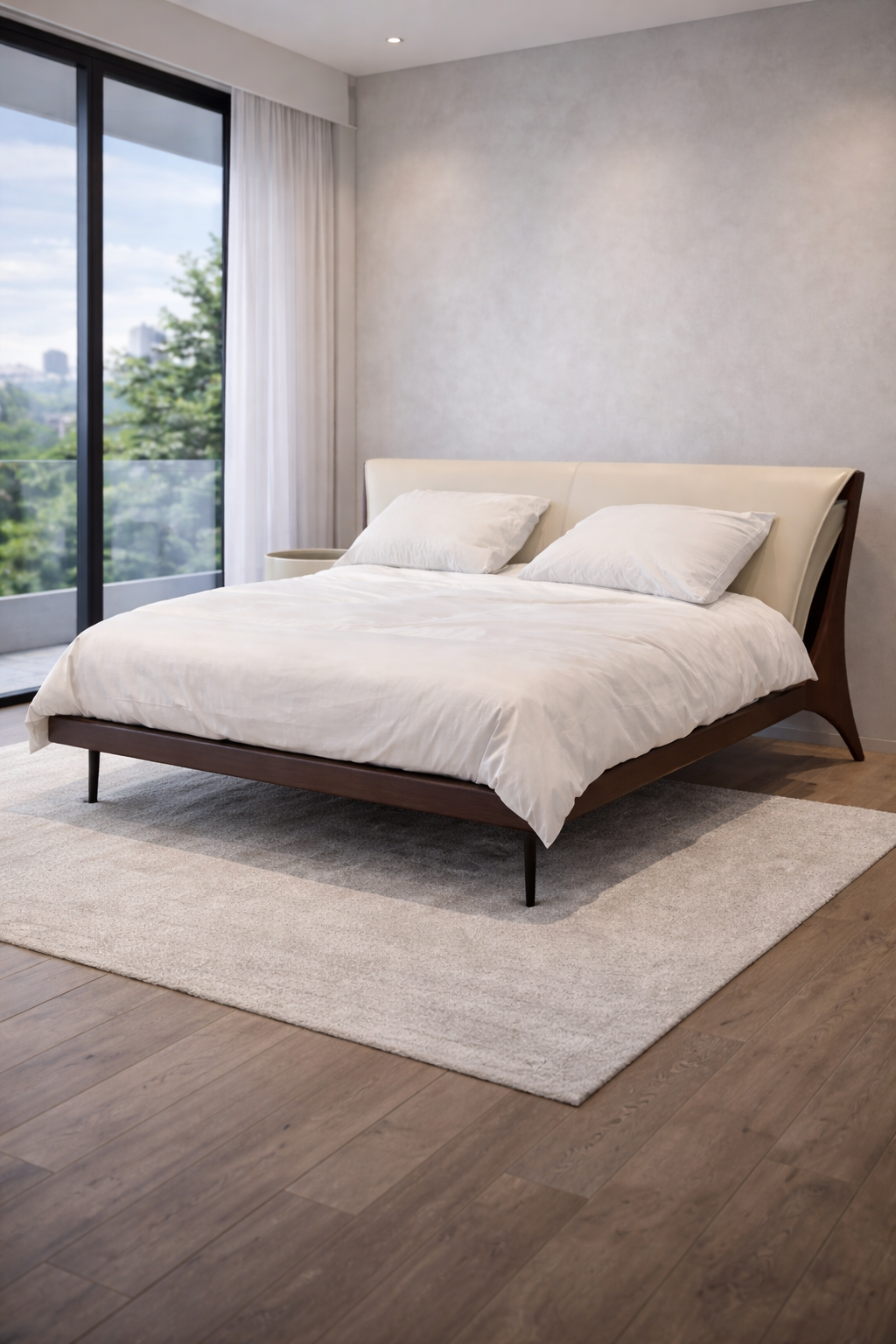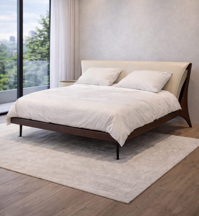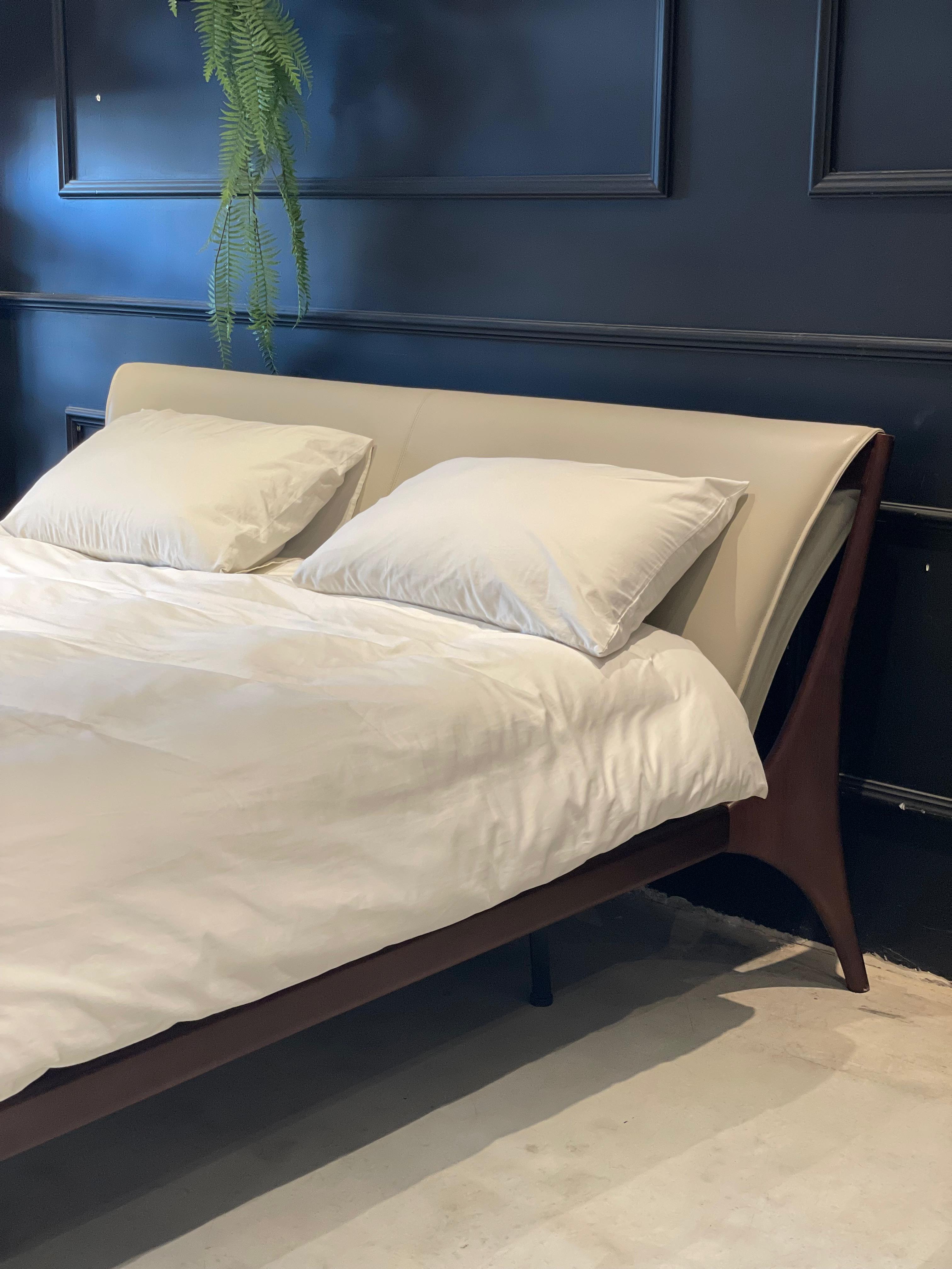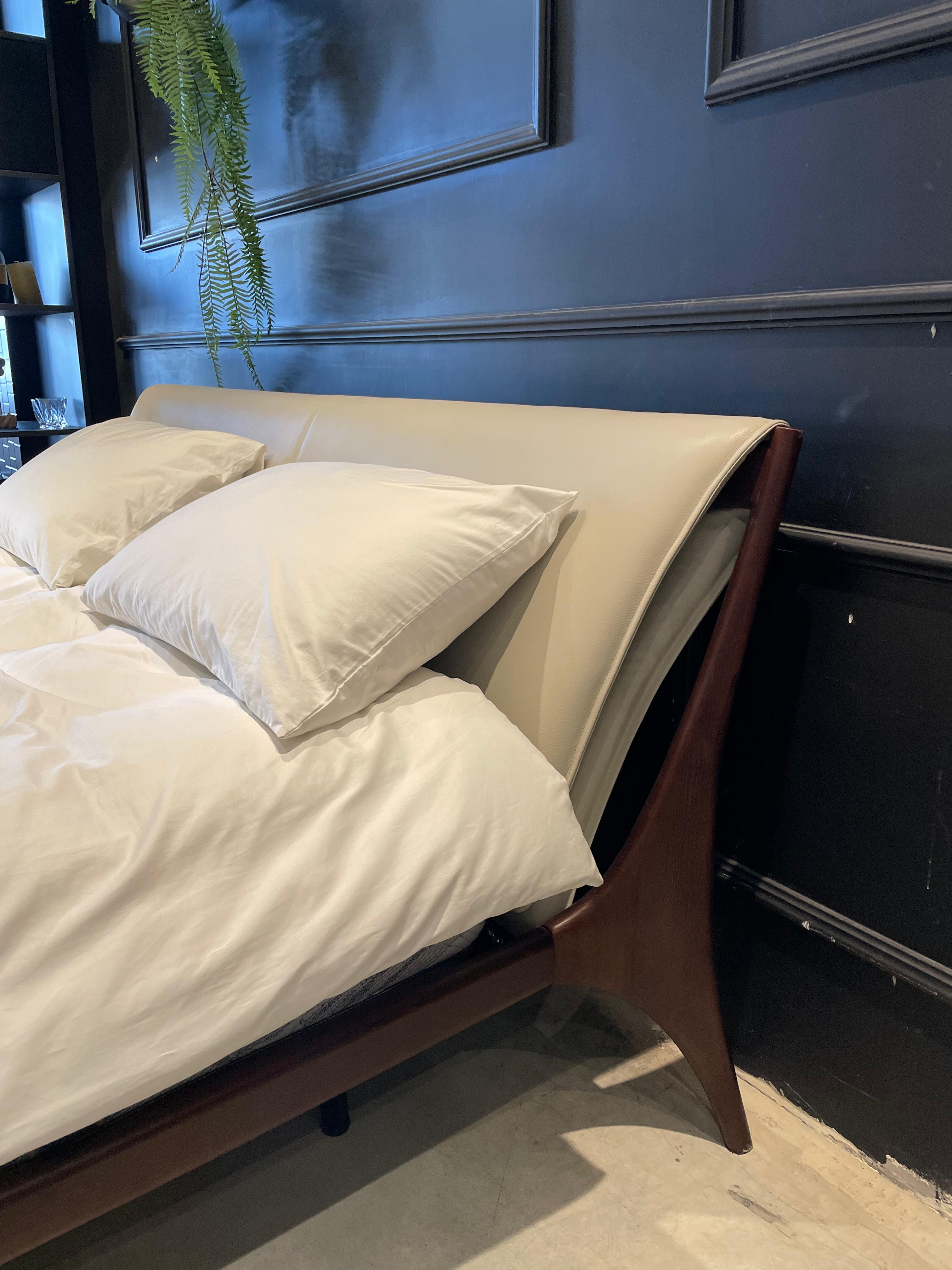 מיטה דגם אש (Ash) עשויה מדמוי עור בגוון בז' ורגלי אגוז.