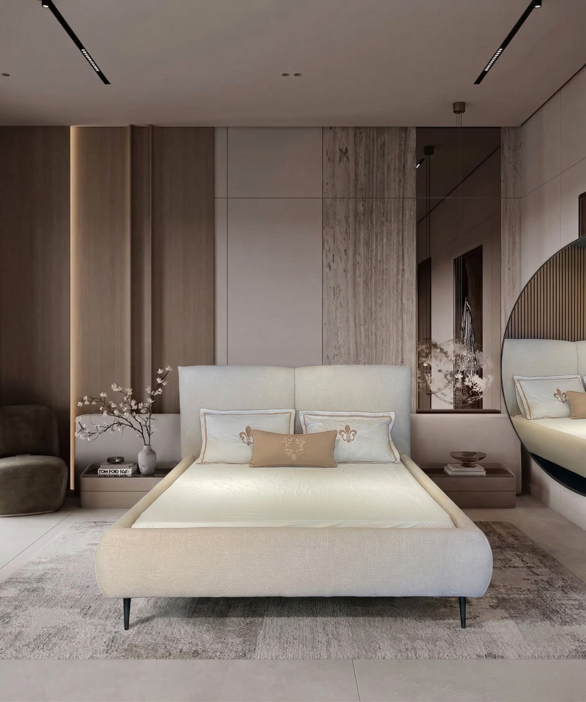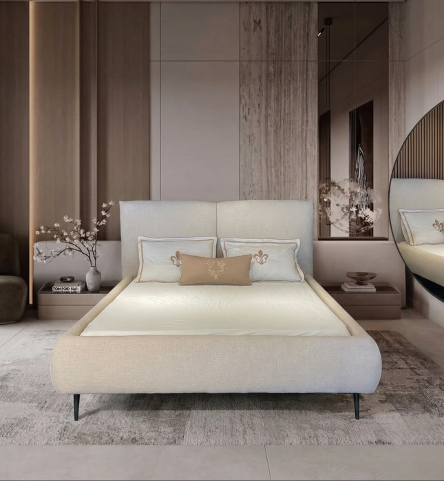מיטה זוגית בעיצוב אלגנטי, עשוי מבד משולב בגוון שמנת, ניתנת להזמנה גם עם ארגז מצעים.