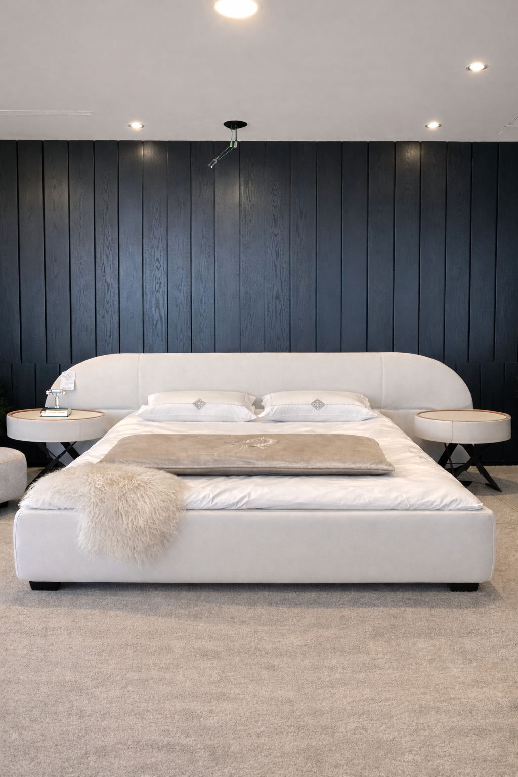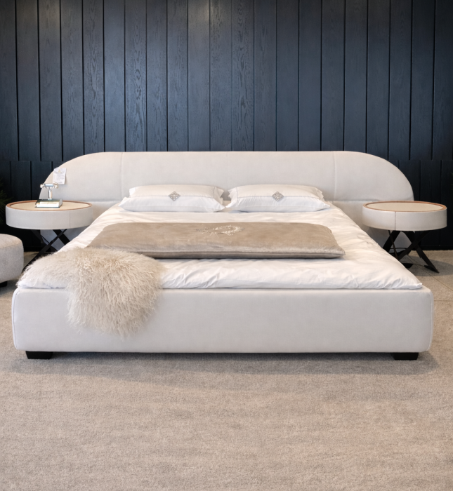 מיטה זוגית בעיצוב יוקרתי ועדין עם גב מוארך ותיפורים מודגשים בגב המיטה.