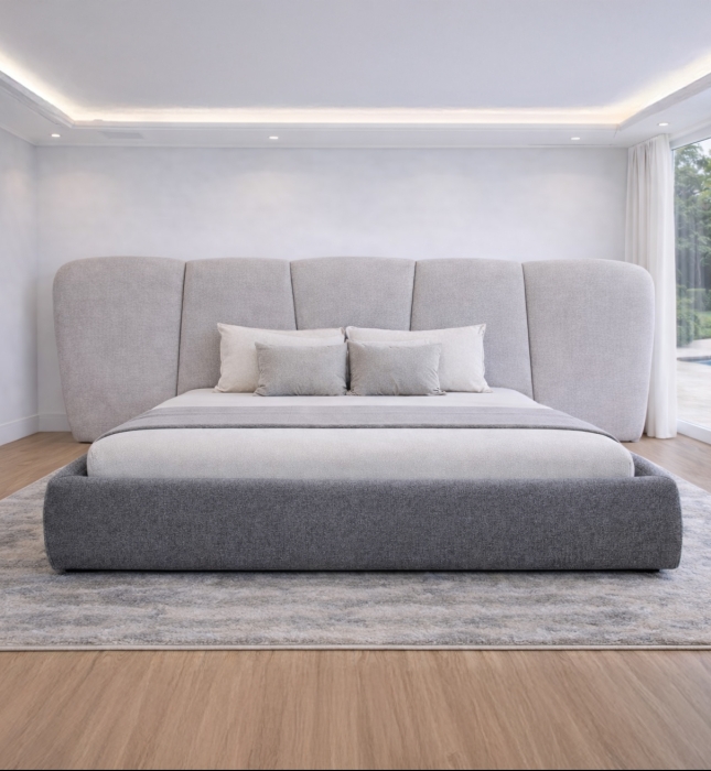 מיטה זוגית בעיצוב אלגנטי, עם גב מרשים בתיפורים מיוחדים מבד משולב בגווני אפור, וניתנת להזמנה גם עם ארגז מצעים.