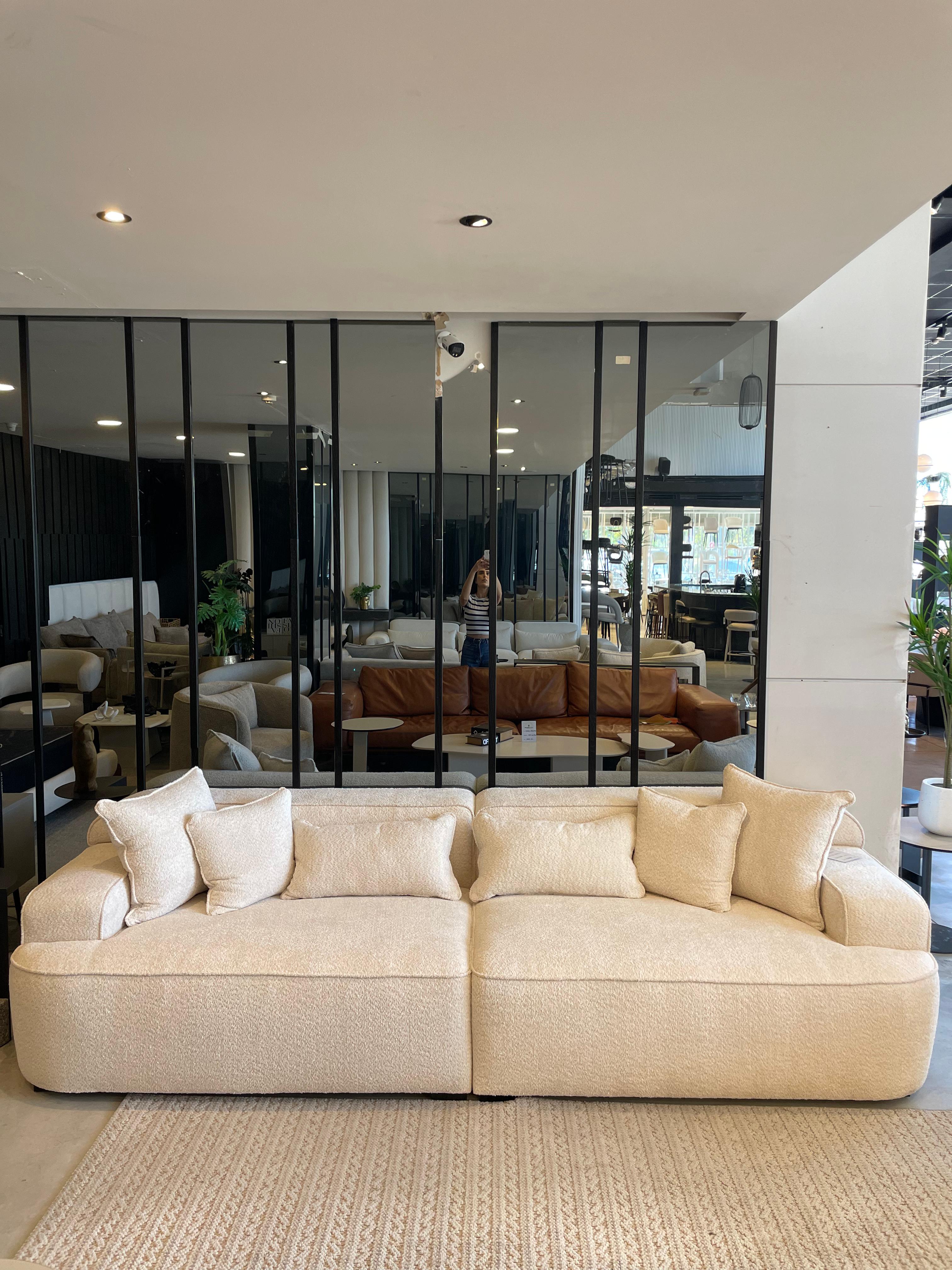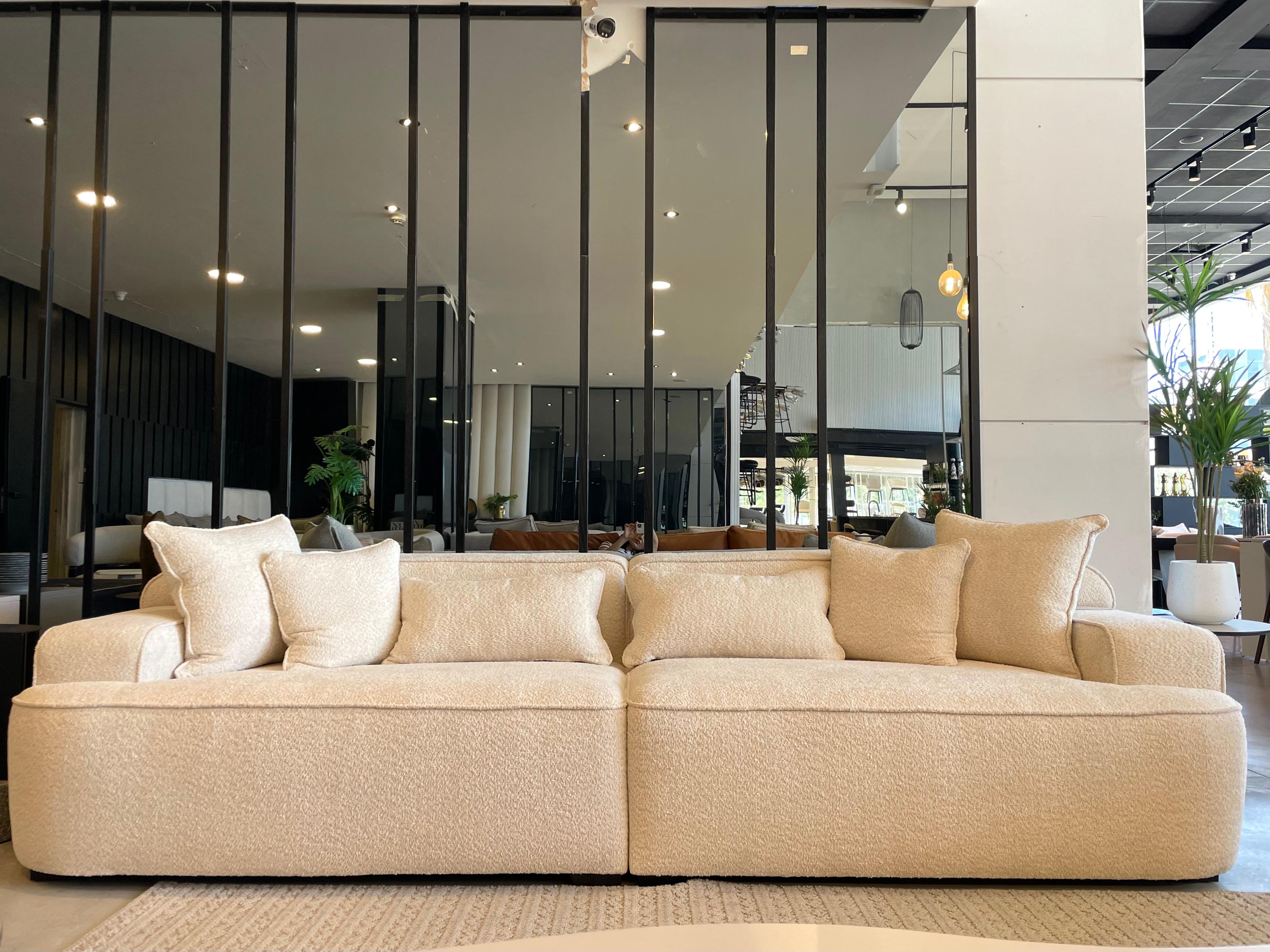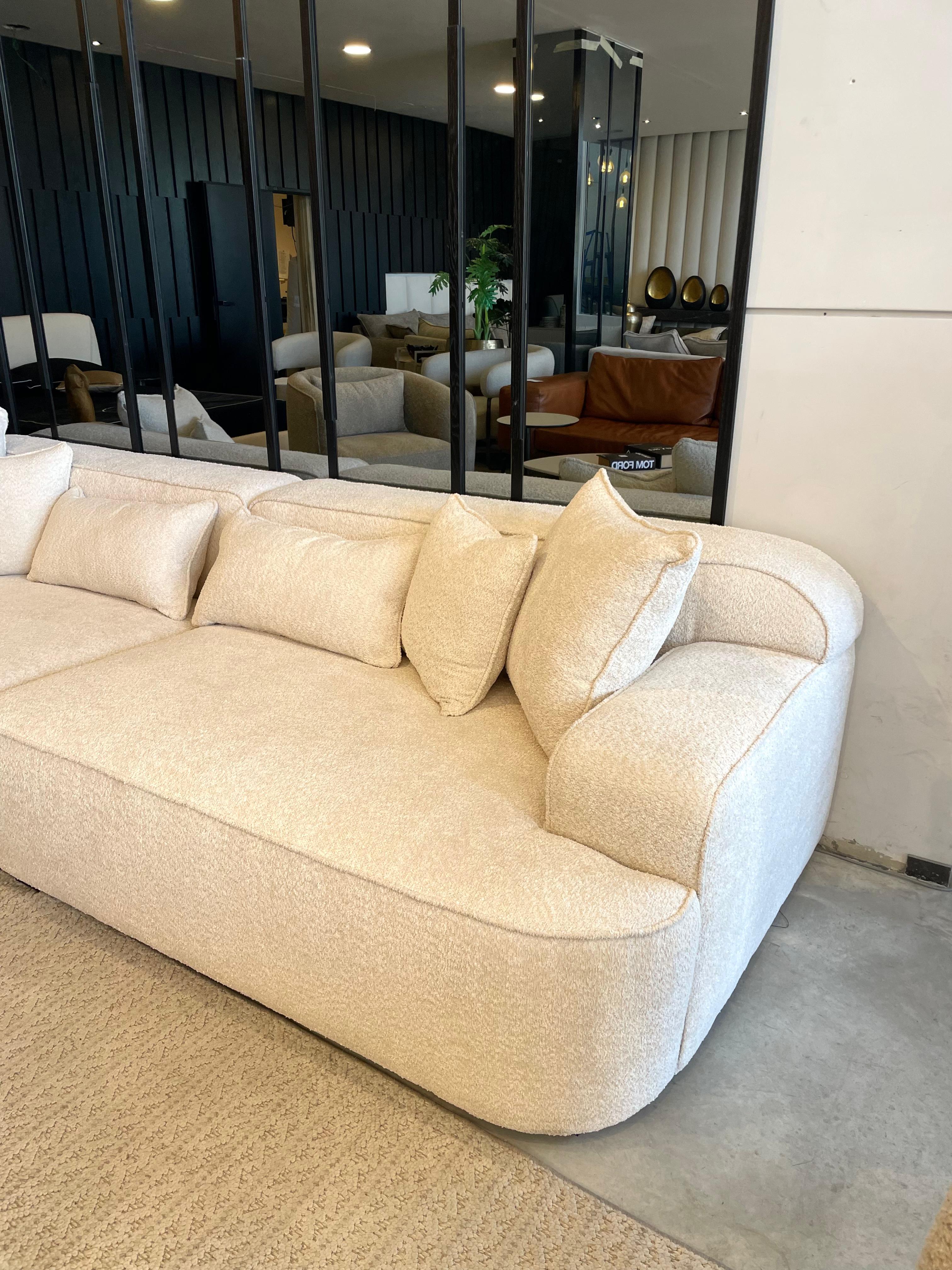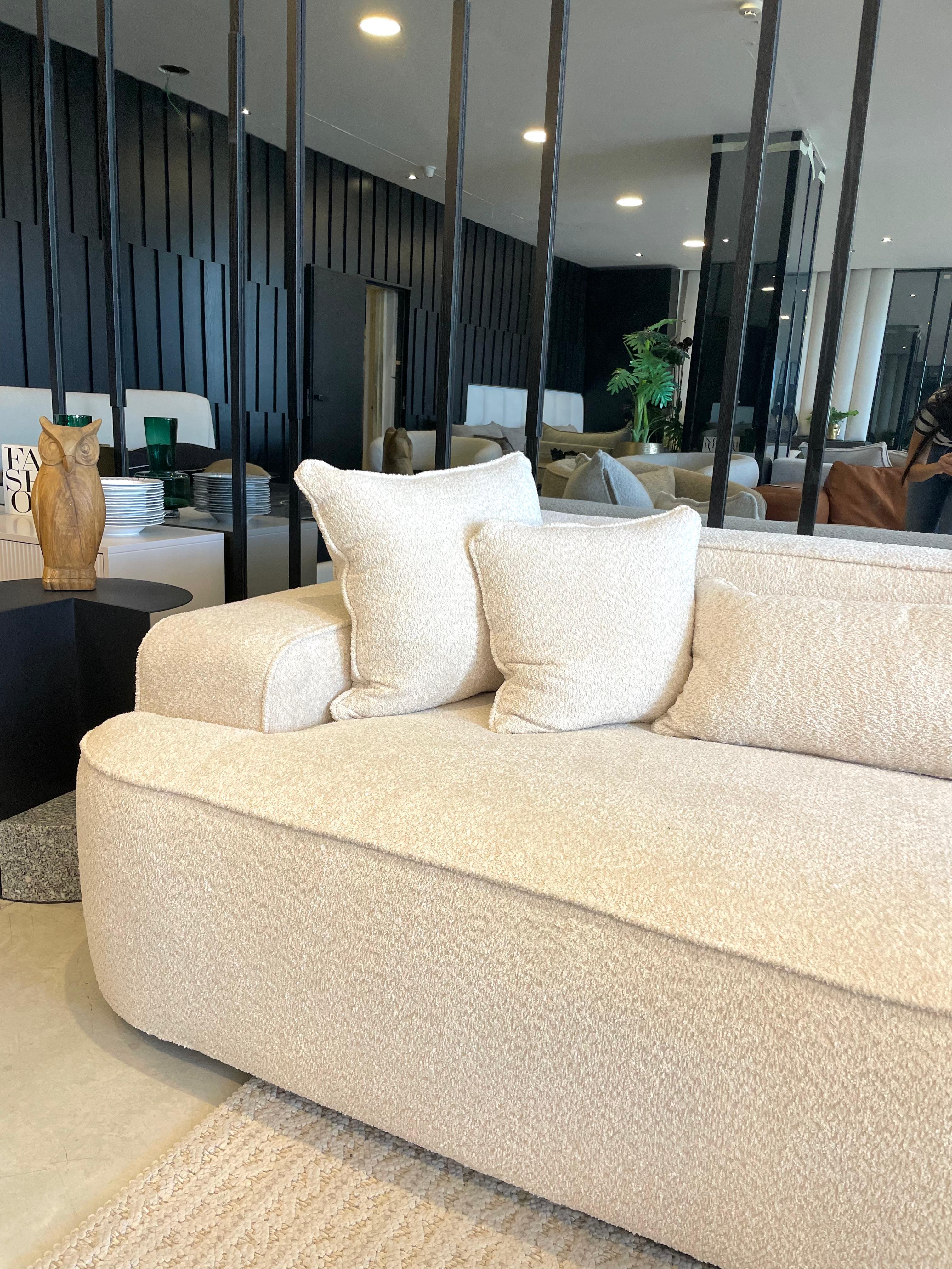 ספה דגם אריאה, עשויה מבד בוקלה עם תיפורים מודגשים.