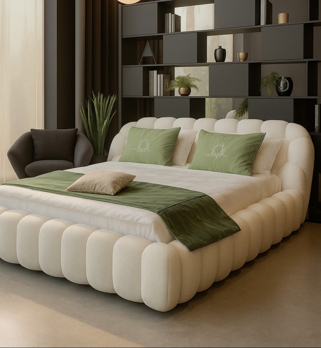 המיטה מעוצבת עם ראש מיטה מרופד במראה ייחודי.