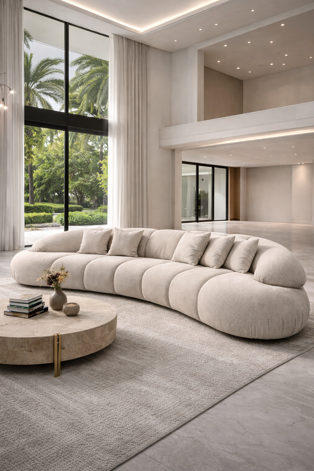 ספה דגם מונקו מעוצבת בסגנון מודרני עם קווים רכים וקימורים בולטים. מרופדת בבד בגוון אבן.