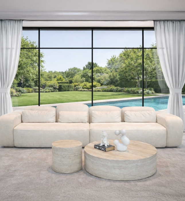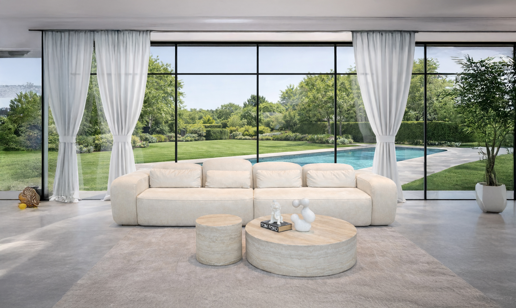 פינת ישיבה דגם סנואו מרופדת בבד בהיר ונעים למגע, עם קווים מעוגלים ושילוב כריות גב עמוקות לישיבה מפנקת ומראה יוקרתי ונקי.