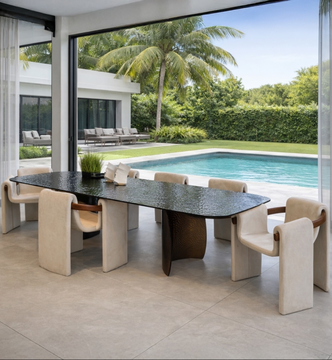 שולחן אוכל דגם שאטו (RY-1185) עשוי מזכוכית בעלת טקסטורה מחוספסת. מגיע במידה 2.80*1.20
