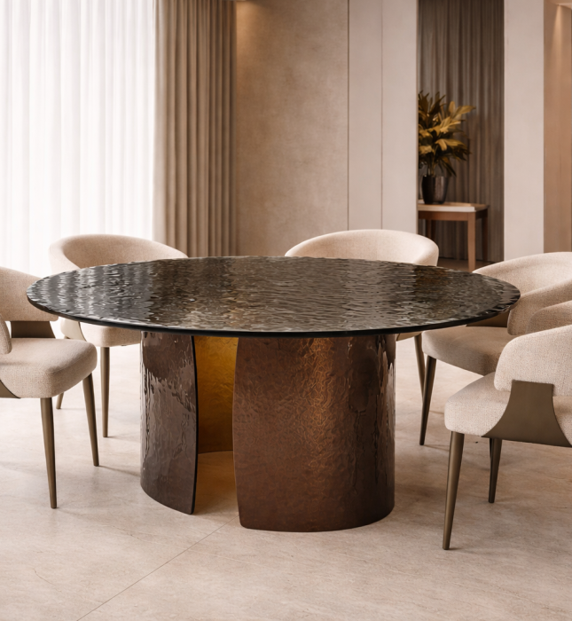 שולחן אוכל עגול דגם שאטו, עשוי מזכוכית מחוסמת בגוון חום.