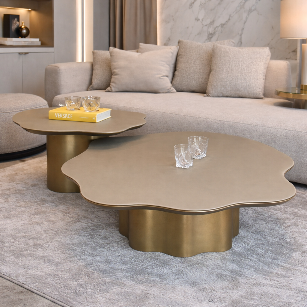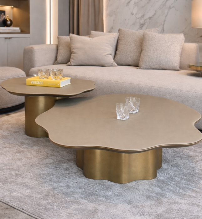 סט שולחנות סלון, עם רגל בגוון זהב ופלטה עשויה דמוי עור בגוון בז'.