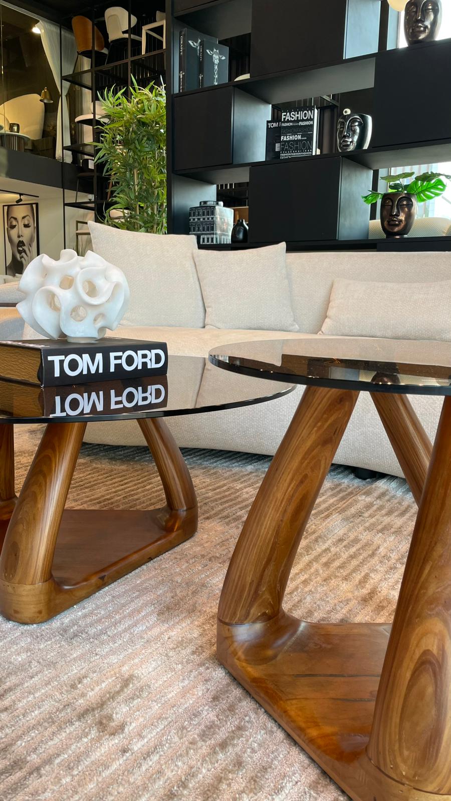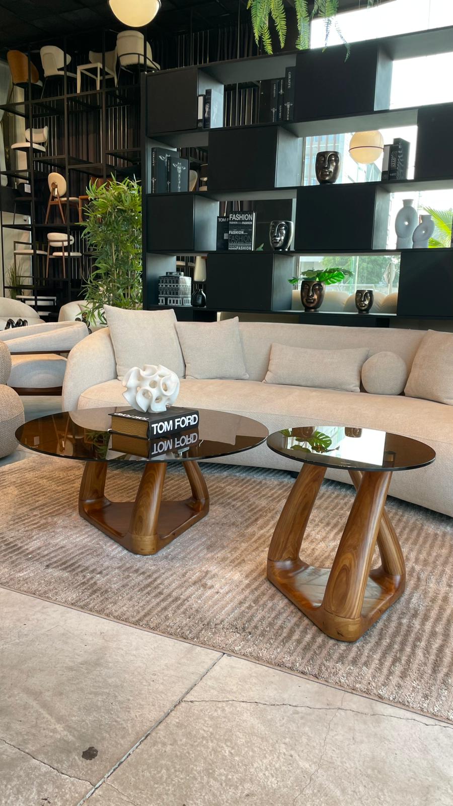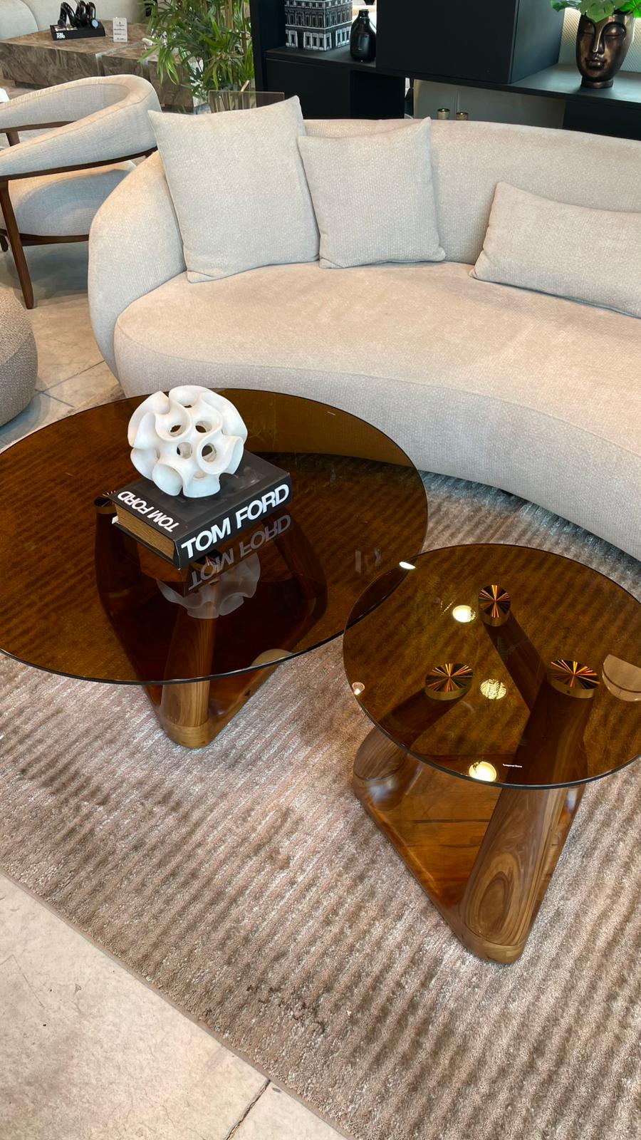 סט שולחנות סלון דגם - עשוי מעץ אגוז וזכוכית בגוון חום.