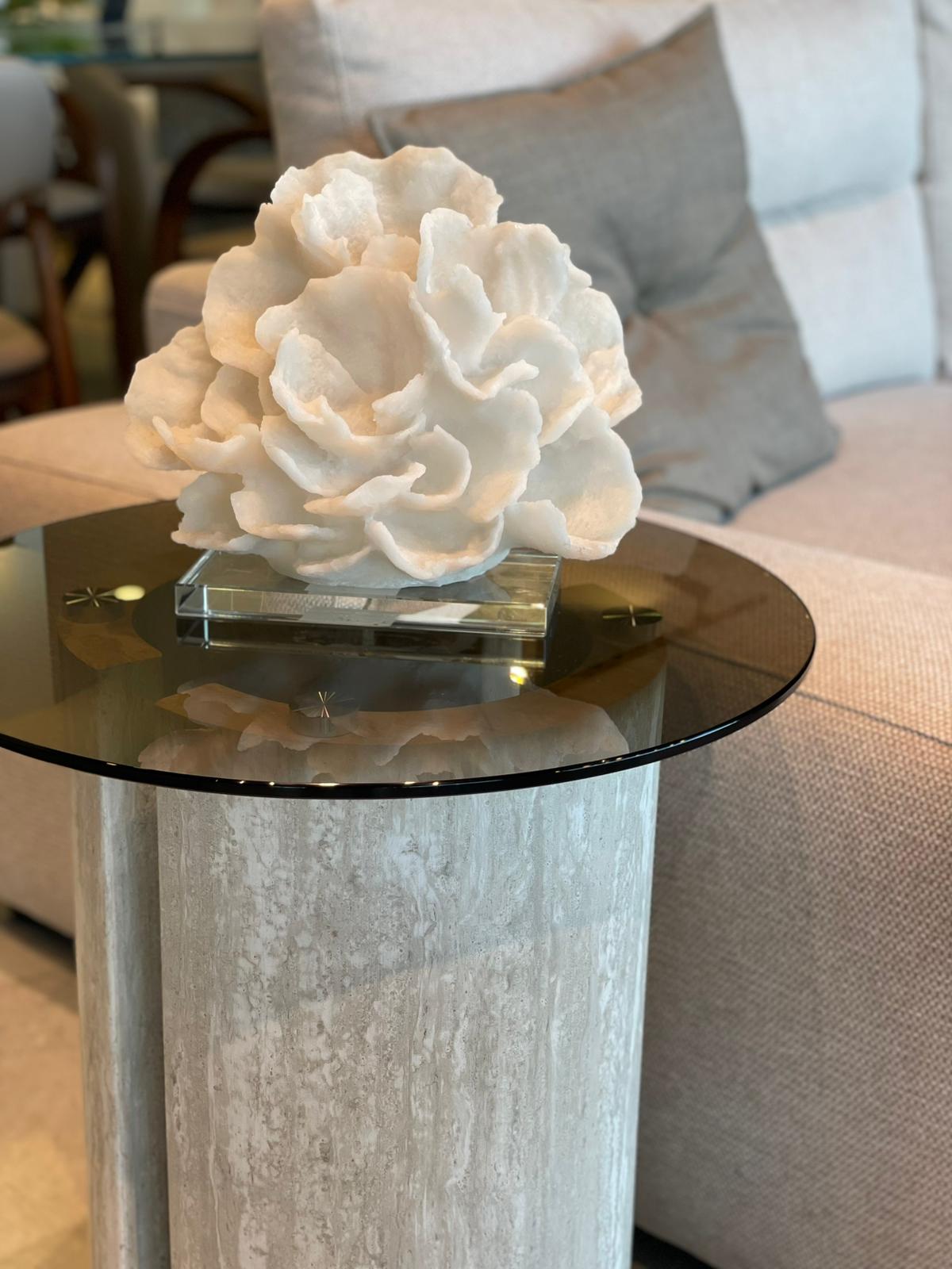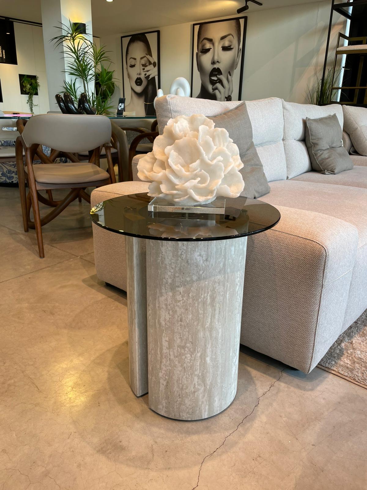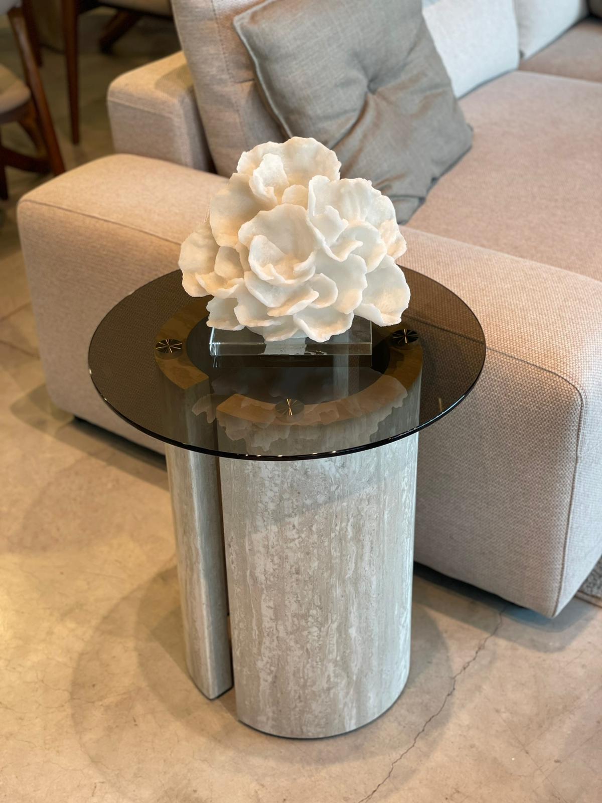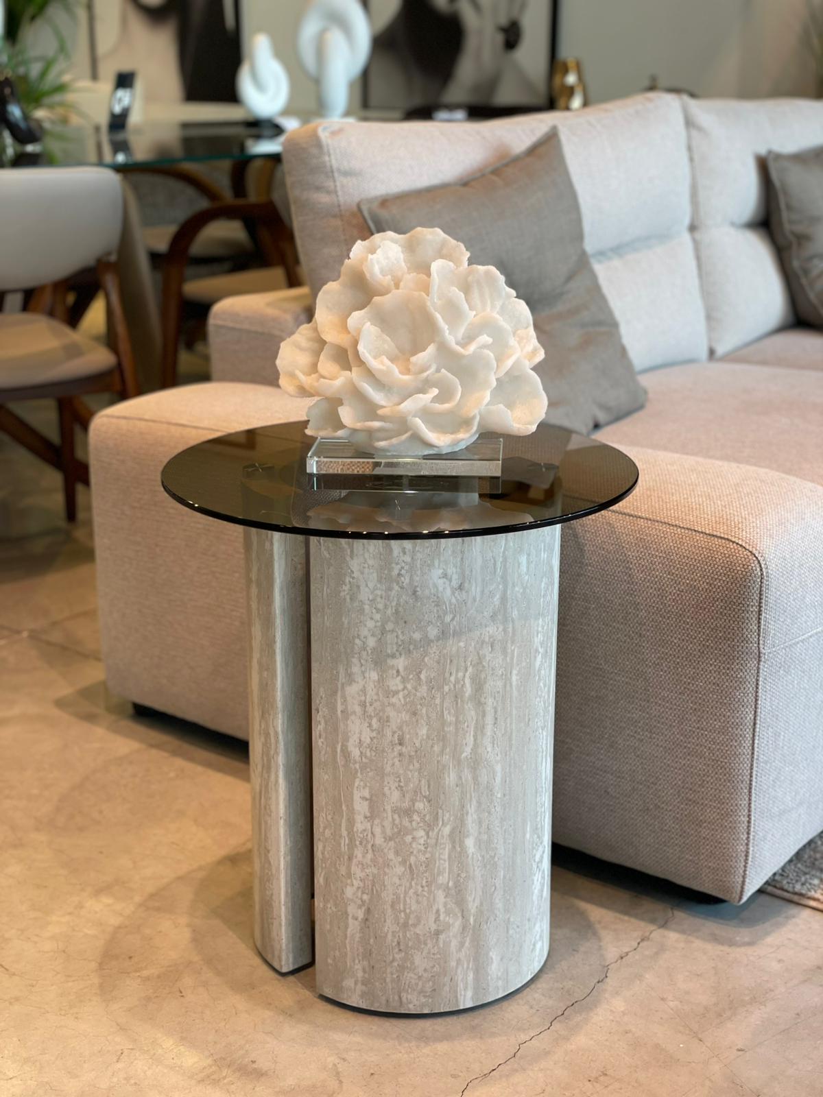 שולחן צד דגם טרוונטין, עשוי מפלטת זכוכית שחורה וגוף טרוונטין.
