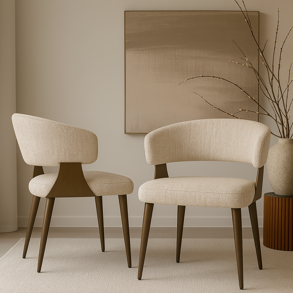 כיסא אוכל דגם דאלי (DC-6723) עשוי בד משולב בגוון בז' ומסגרת בגוון ברונזה מט.
